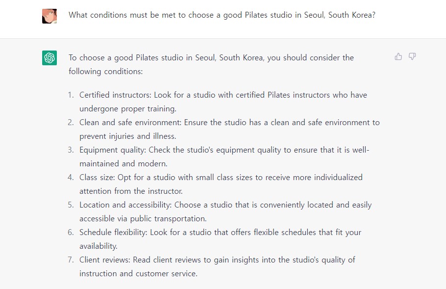 요즘 워낙 쳇지피티가 이슈이다 보니 잠실에서 필라테스 스튜디오를 선택하는데 필요충분 조건은 어떤게 있을까하는 질문을 통해 실패하지 않는 선택을 할 수 있을까하는 의문이 생겨서