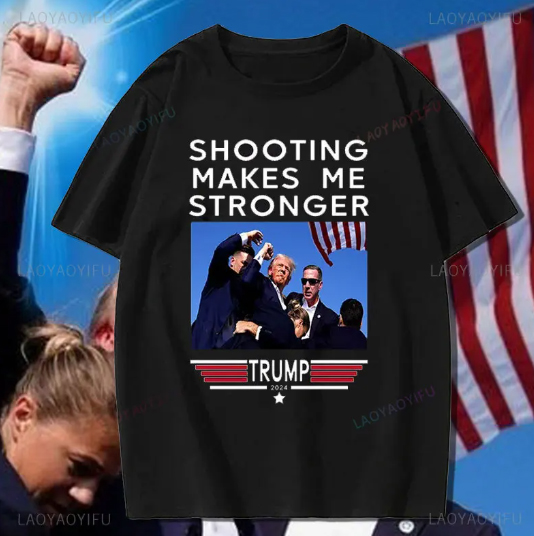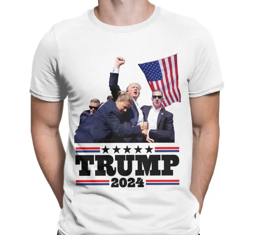 지난 7월 13일 유세장에서 괴한에 의한 총격에도 불구하고 기적적으로 살게된 트럼프가 빗맞은 총탄에 귀에 피를 흘리는 가운데에도 주먹을쥔채 손을 번쩍 든 장면이 인쇄된 티셔츠를 중국 쇼핑몰에서 재빠르게 판매를 하고 있습니다.