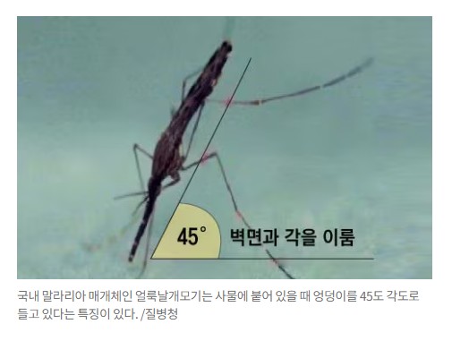 말라리아를 주로 옮기는 모기인 얼룩날개보기는 그림처럼 45도로 기울어져 있다.